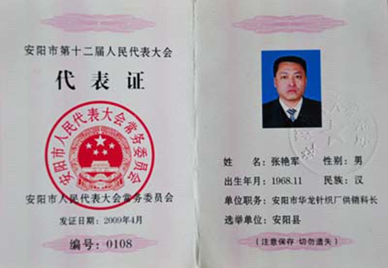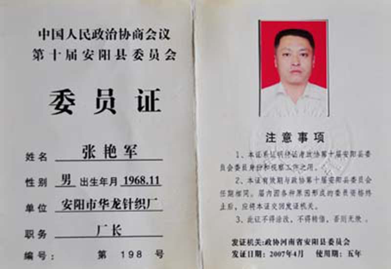 中國人民政治協(xié)商會(huì)議第十屆安陽縣委員會(huì)委員證